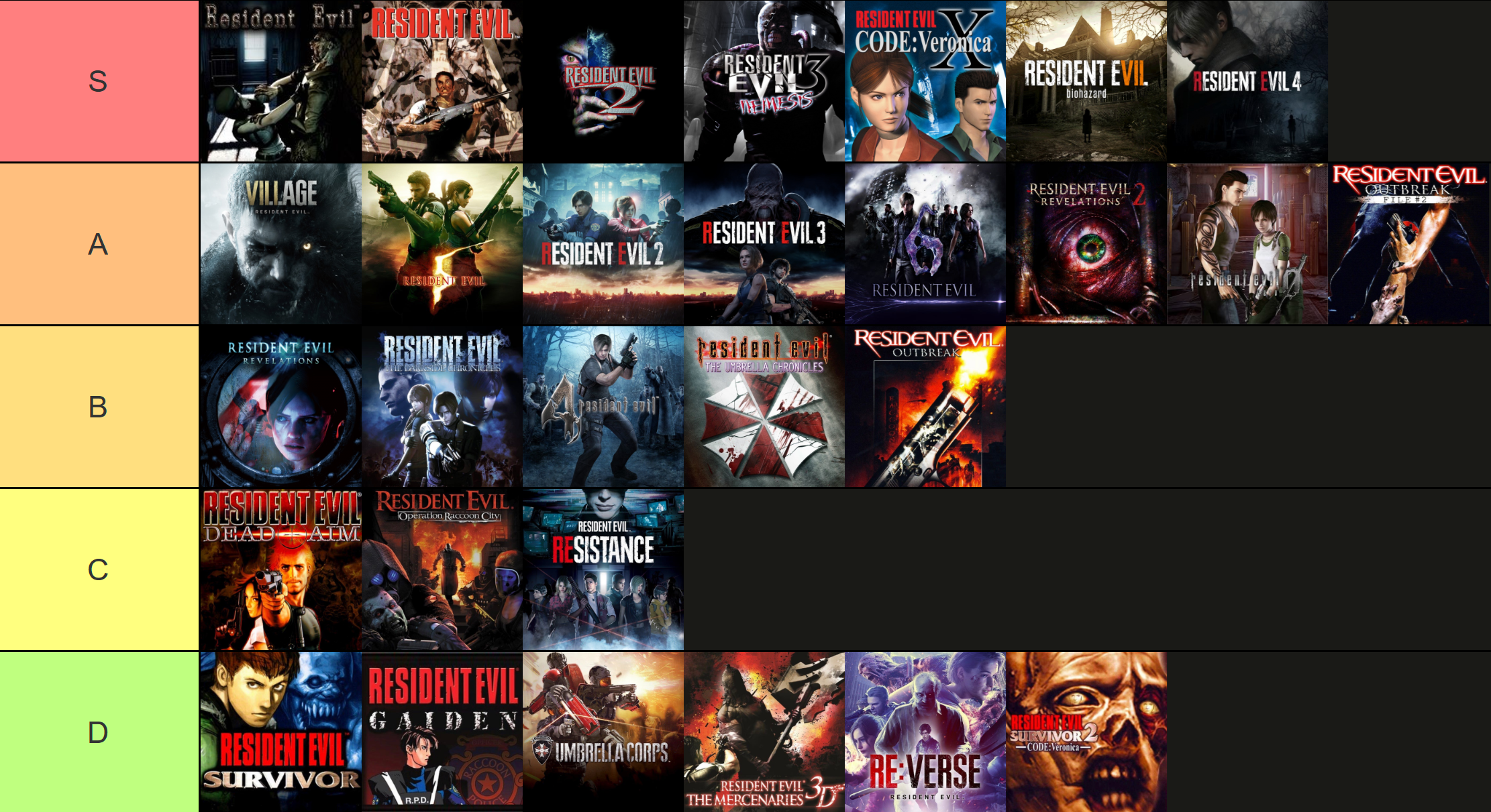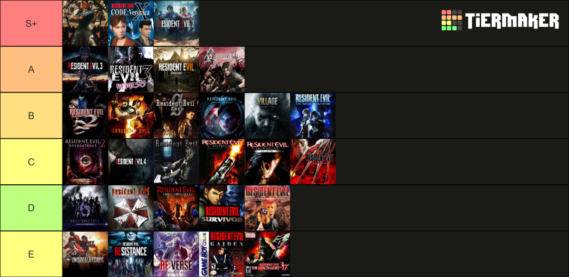 Après, je dirais que concernant mon classement sur la dernière ligne du tableau, j'ai foutu pêle-mêle tous les jeux que je n'aime pas tellement voire pas du tout, Bio6, les nouveaux jeux RE Engine et les Revelations sans particulièrement les classer, et que Village et RE7 devraient en toute logique être en dernier, je vais peut-être modifier cela.