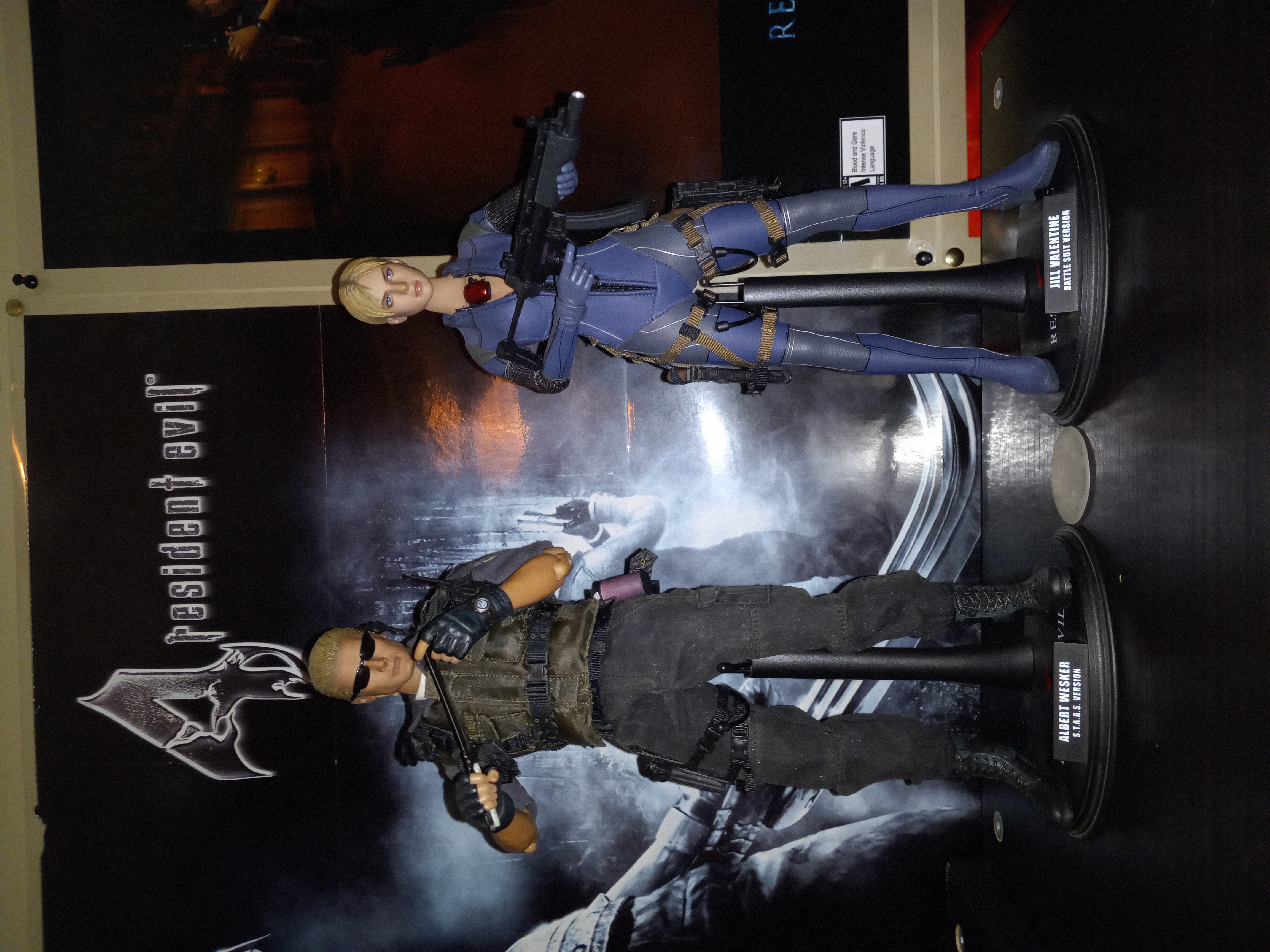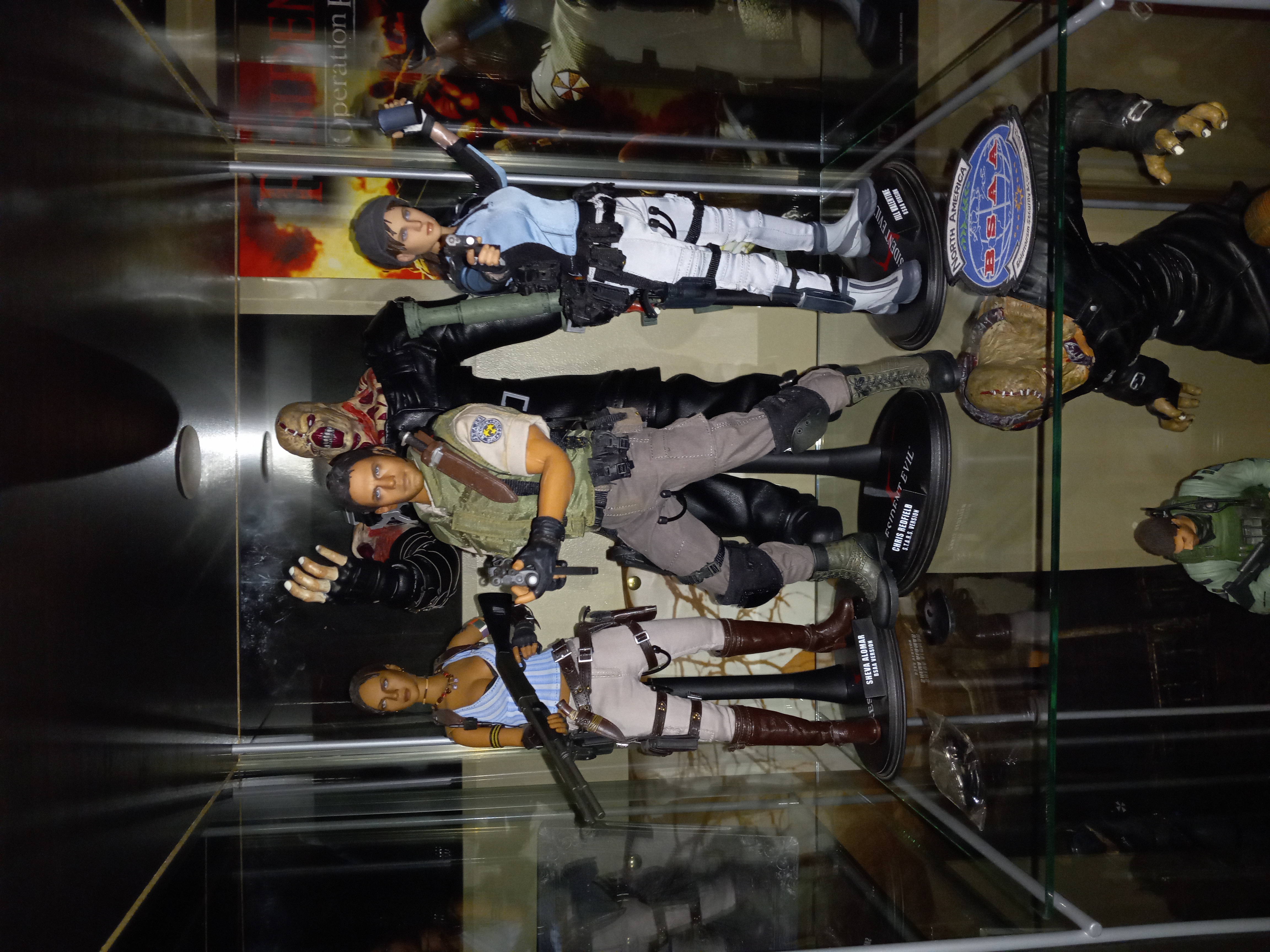 Pour répondre à ta question, j'habite dans le sous-sol de la maison de mon père. Ma collection Resident Evil est situé dans une pièce adjointe de mon salon. Dans l'autre moitié de cet pièce se trouve ma petite collection de figurines et statuette des jeux Mass Effect et ma collection de statuettes Marvel. Oui j'ai investie beaucoup dans ma collection Biohazard mais je l'ai ramassé sur une période de plus de 20 ans. J'ai commencé avec quelque Toy Biz et des Palisade toys et je me suis procuré le reste à travers les années en ramassant tous les goodies Resident Evil que j'ai pu trouver sur mon chemin. Tous acheter dans des boutiques spécialisée et des magasins de jeux vidéos. Certaines des plus récente prisent sur internet comme les Numskull.